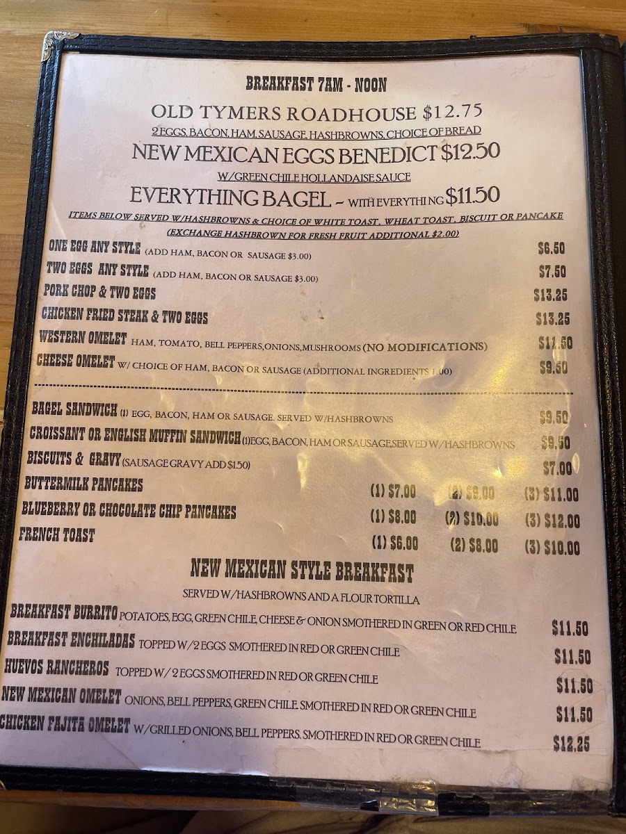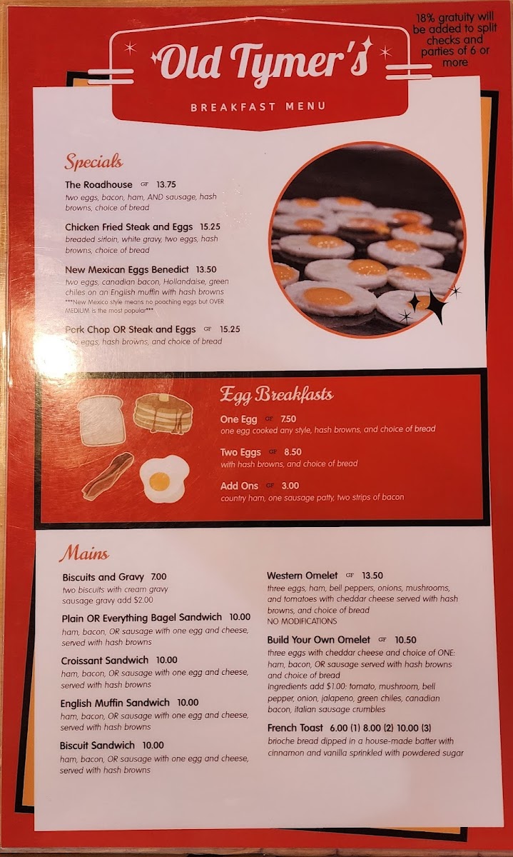 Welcome to Old Tymers Cafe, a cherished gem nestled in Red River, NM. This cozy eatery captures the essence of New Mexican cuisine, offering a thoughtful menu that celebrates hearty breakfasts and satisfying lunch or dinner plates. Each morning begins with delightful options like the Breakfast Burrito and Huevos Rancheros, all priced affordably at around $12.50. The Chicken Fajita Omelet stands out at $13.75, bursting with flavor.